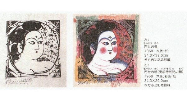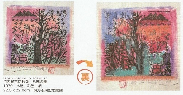 作品を見ていて、板画なのか倭画なのか私には区別できないものが沢山ありました。それは、板画の裏から色を付ける“裏彩色”技法が用いられているからの様です。校外学習用というか、子供用と思われる“裏彩色を体験しよう”というパンフレットを見つけました。同じ板を使用したモノクロの“門世の柵(もんせいのさく)”と裏彩色をした“門世の柵(安於母利妃(あおもりひ)の柵)”を見比べてください。裏彩色をすると板画で刷ったものとは思えない柔らかさが出ると思いませんか。同じ資料に表と裏を示したものもありました。裏からかなり濃く色を置き、染み込ませているようです。裏彩色だからこその柔らかい表現だと思います。