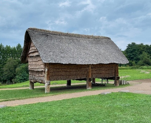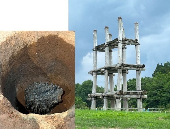 発掘された栗の柱 復元された大型掘立柱建物