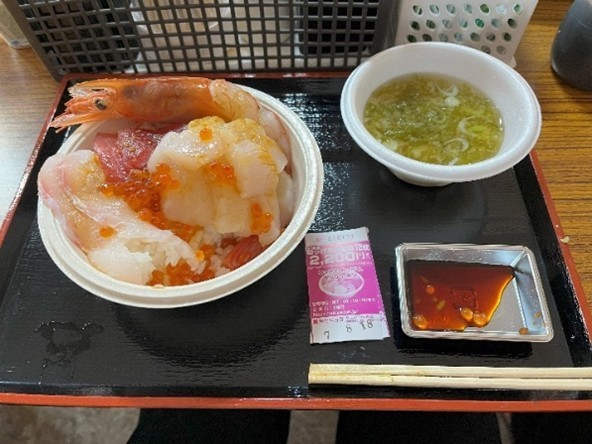 のっけ丼は青森駅近くの“青森魚菜センター”で食べられます。最初に12枚綴りのチケットを購入、丼ご飯やみそ汁、上に“のっける”好みの海産物を選んでチケットと交換していきます。センターの中には、間口4~5mの鮮魚店が列をなし、マグロ、タイ、サーモン、イカ、タコ、エビ、ウニ、いくら、ホタテ、などを並べています。どれも美味しそう。私ののっけ丼を見てください。写真を撮る前についパクリ。