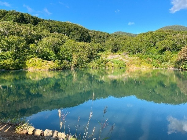 お茶を一服、早い夕食までにまだ時間があるので、旅館の周囲を散歩します。所々にクマに注意の看板があるので、妻が心配して遊歩道に入るのを躊躇、あきらめて車道沿いを歩きました。しばらく進むと、かすかに硫黄臭がする“地獄沼”がありました。丁度良い時間帯だったのでしょう、水面が鏡面になり、きれいに山と空・雲が映り込んでいます。名前に反して穏やかな景色です。