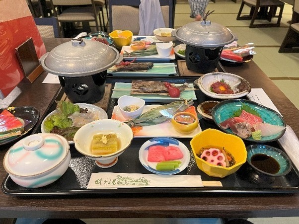 夕食は、大広間で一人一人にお膳を準備してくれます。最近のホテルでは食べ放題のビュッフェが多い中、おいしいものを適量食べるこのスタイルが私は好きです。もちろん冷酒を注文しました。連泊客には、二日目には異なる料理を用意してくれます。二日目のご飯はお米から炊く釜めしでした。小さな固形燃料一つで釜めしが炊けるんですね。そういえば、娘が一人暮らしの時に、「峠の釜めし」の釜を持ち帰り、一人前のご飯を炊いていました。陶器の釜で美味しく炊けるのです。