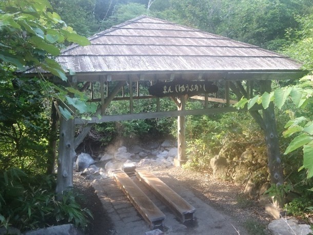 車道の、地獄沼と反対側に入ると、狭いですが、草も生えていない荒地“賽の河原”があり、その先には“まんじゅうふかし”があります。木製の箱型ベンチの中に温泉の熱湯を通しているのでしょう、気持ちの良い暖かさです。ここに十分腰掛けると子宝に恵まれるそうです。一緒に腰かけた若いカップルは年配の女性達に軽くいじられたりして。