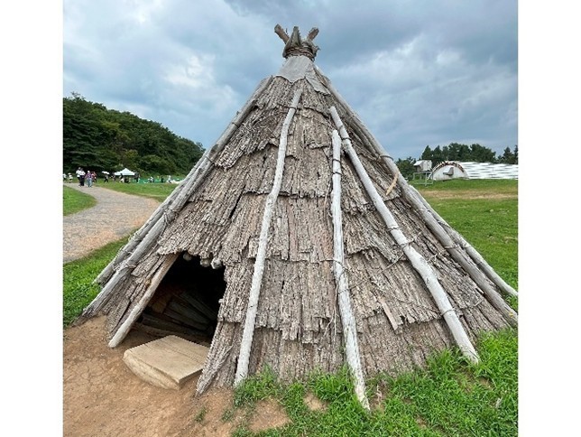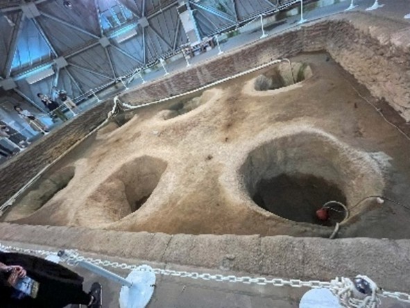 大型掘立柱建物跡には直径2mの穴が縦横4.2m間隔で6個あり、その穴には直径1mの栗の木の柱が残っています。栗の木はこんなに太く大きくなるとは知りませんでした。復元した建物の柱は垂直ではなく、内側に少し傾いていますが、これは発掘した穴と残っていた柱に従っています。復元した建物で言うと、上層階の床面積が狭くなります。こうすることにより強度が増すのでしょう。人類の開発した科学技術は蓄積していくので縄文時代と現代では大きな差が有りますが、縄文人と現代人の能力には大差無いはずです。