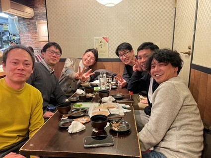 新年会の様子。左から山本、石岡、木村、大夛賀、山口、藤野